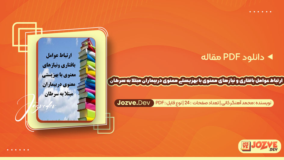 سایت جزوه دانلود PDF مقاله ارتباط عوامل بافتاری و نیازهای معنوی با بهزیستی معنوی در بیماران مبتلا به سرطان محمد آهنگر کانی 24 صفحه پی دی اف را برای شما دوستان فراهم کرده است مقاله “ارتباط عوامل بافتاری و نیازهای معنوی با بهزیستی معنوی در بیماران مبتلا به سرطان” نوشته محمد آهنگر کانی، به بررسی تأثیر عوامل اجتماعی و فرهنگی بر سلامت معنوی بیماران سرطانی میپردازد. این تحقیق نشان میدهد که بافت اجتماعی و فرهنگی میتواند تأثیر عمیقی بر نحوه برخورد بیماران با بیماری و نیازهای معنوی آنها داشته باشد. با سایت جزوه همراه باشید.