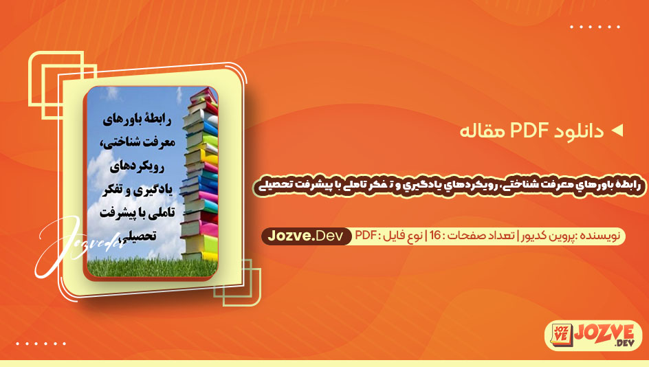 سایت جزوه دانلود PDF مقاله رابطۀ باورهاي معرفت شناختی، رویکردهاي یادگیري و تفکر تاملی با پیشرفت تحصیلی پروین کدیور 16 صفحه پی دی اف را برای شما دوستان فراهم کرده است مقاله پروین کدیور به بررسی رابطۀ بین باور های معرفت شناختی، رویکرد های یادگیری و تفکر تاملی با پیشرفت تحصیلی می پردازد. این تحقیق تأکید می کند که باور های دانش آموزان در مورد یادگیری و دانش، تأثیر مستقیمی بر روش های یادگیری آن ها دارد. بنابر این تحقیق، باور های مثبت و سازنده می تواند منجر به ایجاد انگیزه و افزایش پیشرفت تحصیلی شود. با سایت جزوه همراه باشید.