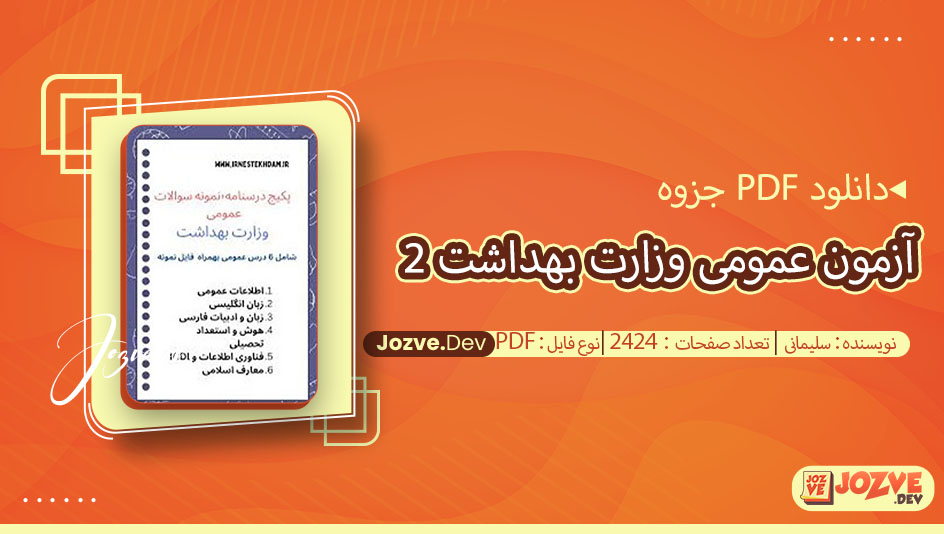 سایت جزوه دانلود PDF جزوه سوالات آزمون عمومی وزارت بهداشت 2 سلیمانی 2424 صفحه پی دی اف را برای شما دوستان فراهم کرده است. این جزوه ها معمولاً شامل مجموعه ای از سوالات آزمون های سال های گذشته و سوالات مشابه طراحی شده بر اساس سرفصل های آزمون می باشند. هدف این جزوات، آشنایی داوطلبان با نوع سوالات و همچنین تمرین و مرور مطالبی است که در آزمون های استخدامی اهمیت دارند. در این جزوه ها معمولاً بخش های مختلفی مانند زبان و ادبیات فارسی، معارف اسلامی، زبان انگلیسی عمومی، ریاضی و آمار مقدماتی، و مسائل مربوط به اطلاعات عمومی، دانش اجتماعی و حقوق اساسی کشور گنجانده شده است.با سایت جزوه همراه باشید.