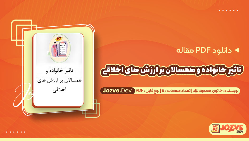 سایت جزوه دانلود PDF مقاله تاثیر خانواده و همسالان بر ارزش های اخلاقی خاتون محمود نژاد 9 صفحه پی دی اف را برای شما دوستان فراهم کرده است.مقاله تأثیر خانواده و همسالان بر ارزش های اخلاقی خاتون محمودنژاد به بررسی نقش این دو عامل در شکل گیری ارزش های اخلاقی فرد می پردازد. خانواده به عنوان نخستین نهاد اجتماعی، تأثیر عمیقی بر شخصیت و باور های اخلاقی فرد دارد. والدین و اعضای خانواده الگو های رفتاری و استدلال های اخلاقی را به فرزندان منتقل می کنند که این فرآیند به شکل گیری هویت اخلاقی آنها کمک می کند. با سایت جزوه همراه باشید.