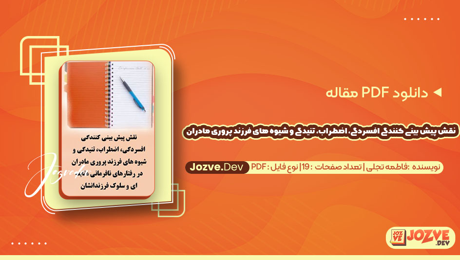 سایت جزوه دانلود PDF مقاله نقش پیش بینی کنندگی افسردگی، اضطراب، تنیدگی و شیوه های فرزند پروری مادران در رفتارهای نافرمانی مقابله ای و سلوک فرزندانشان فاطمه تجلی 19 صفحه پی دی اف را برای شما دوستان فراهم کرده است مقاله فاطمه تجلی به بررسی نقش پیشبینیکنندگی افسردگی، اضطراب و تنیدگی مادران در رفتارهای نافرمانی و سلوک فرزندانشان پرداخته است. این پژوهش به تحلیل این موضوع میپردازد که چگونه وضعیت روانی مادران میتواند تأثیر عمیقی بر رفتارهای فرزندان و نیز شیوههای فرزندپروری آنها داشته باشد. اطلاعات جمعآوریشده از طریق پرسشنامهها و مشاهدههای میدانی به درک بهتری از این ارتباط کمک میکند. با سایت جزوه همراه باشید.