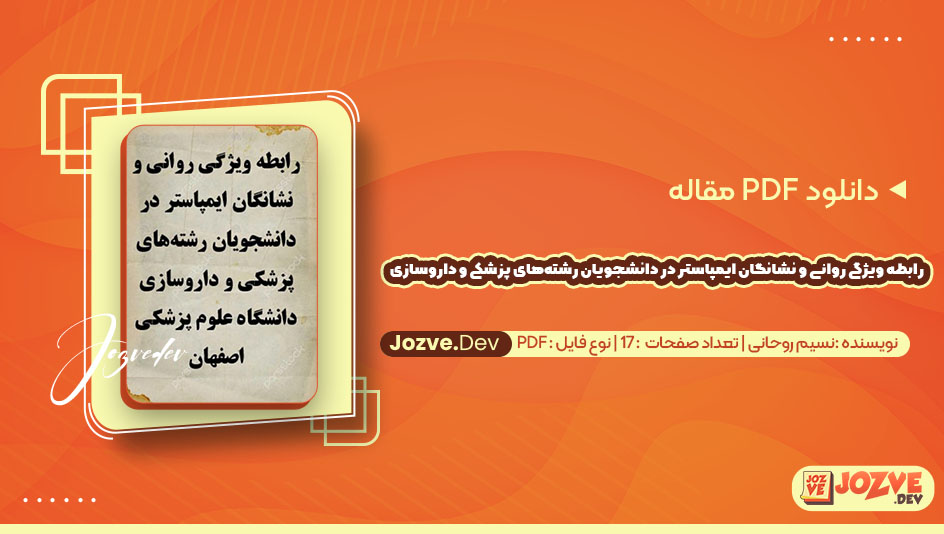 سایت جزوه دانلود PDF مقاله رابطه ویژگی روانی و نشانگان ایمپاستر در دانشجویان رشتههای پزشکی و داروسازی دانشگاه علوم پزشکی اصفهان نسیم روحانی ۱۷ صفحه پی دی اف را برای شما دوستان فراهم کرده است مقالهای که به بررسی رابطه ویژگیهای روانی و نشانگان ایمپاستر در دانشجویان رشتههای پزشکی و داروسازی دانشگاه علوم پزشکی اصفهان پرداخته است، به اهمیت سلامت روانی و احساسات فردی در موفقیت تحصیلی میپردازد. نشانگان ایمپاستر به طور خاص به احساس عدم کفایت و ترس از افشا شدن در میان موفقیتها اشاره دارد. این مطالعه تلاش کرد تا ابعاد مختلف روانی، مثل خودکارآمدی و اضطراب را در این زمینه مورد بررسی قرار دهد. با سایت جزوه همراه باشید.