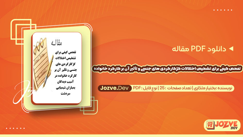 سایت جزوه دانلود PDF مقاله تفحص کیفی برای تشخیص اختلالات کژکارکردی های جنسی و تأثیر آن بر کارکرد خانواده در آسیب دیدگان بمباران شیمیایی سردشت بختیار ملکاری 25 صفحه پی دی اف را برای شما دوستان فراهم کرده است مقاله تفحص کیفی در مورد اختلالات کژ کارکردی های جنسی و تأثیر آن بر کارکرد خانواده در آسیب دیدگان بمباران شیمیایی سردشت، به بررسی ابعاد اجتماعی و روانی این اختلالات می پردازد. در این مطالعه، محققان به تحلیل تجربیات و نگرش های افراد آسیبدیده از بمباران شیمیایی پرداخته اند و تلاش کردهاند تا آثار روانی و جسمی این رویداد فاجعه بار را بر روابط خانوادگی بررسی کنند. با سایت جزوه همراه باشید.